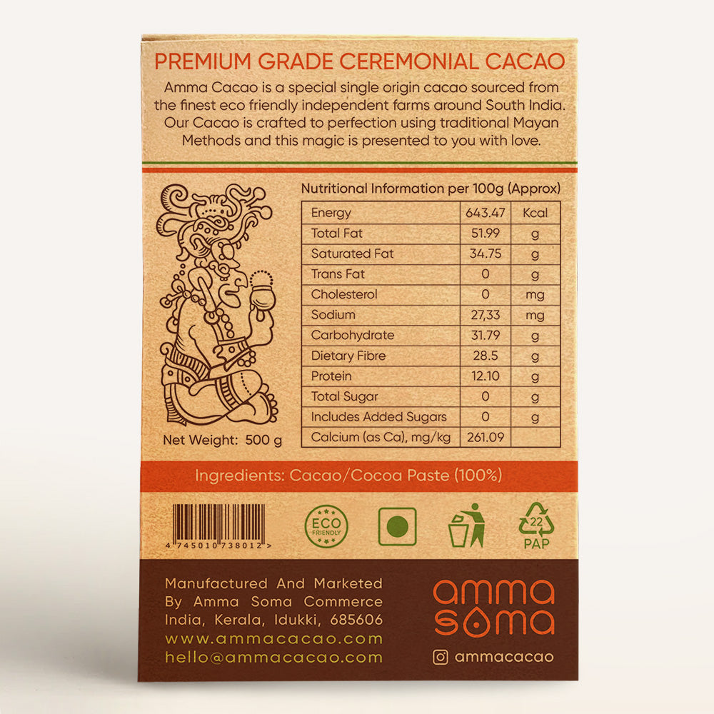Dive deep into the heart of traditional cacao rituals with our 100% Premium Ceremonial grade Amma Cacao. Crafted scientifically and by hands with special care from the finest cacao beans, this pure ceremonial-grade cacao invites you on a journey to explore the rich, unadulterated flavors and transformative energy of cacao. Perfect for meditation, creative exploration, or simply savoring the depth of cacao in its most authentic form, our ceremonial cacao connects you to ancient traditions and the healing power of nature.